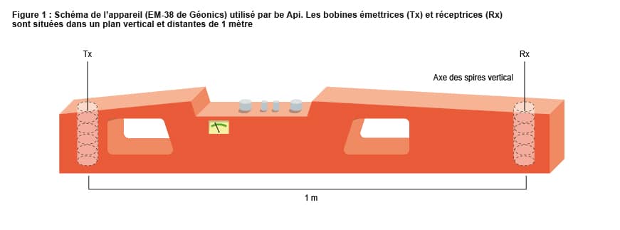 La transmission d’un champ électromagnétique dans le sol est fortement corrélée à sa conductivité apparente. Cette technique utilise deux bobines. La première, parcourue par un courant électrique d’une fréquence donnée produit un champ magnétique dit primaire de même fréquence qui induit dans le sol qu’il traverse des courants électriques, eux-mêmes générant à leur tour un champ magnétique secondaire mesuré à l’aide de la seconde bobine. La conductivité apparente du sol (exprimée en milli-siemens par m) est calculée à partir du rapport entre la valeur du champ magnétique secondaire et celle du champ magnétique primaire et des caractéristiques de l’appareil de mesure (distance et position des deux bobines notamment). Ce type de mesure est facile à mettre en œuvre, sans perturbation du sol, ni prélèvement d’échantillon. L’appareil est simplement posé sur le sol ou traîné horizontalement sur un support dédié pour acquérir des mesures en continue. Il n’y a donc pas de problème de contact sol-sonde et la mesure est immédiate.