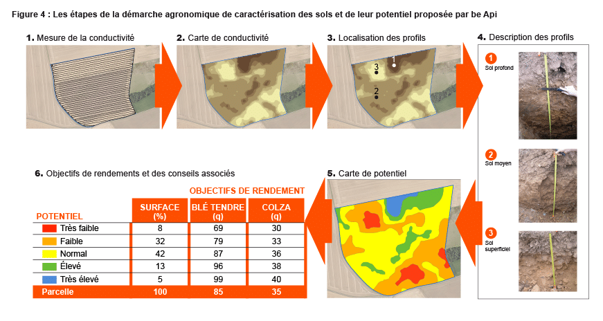 Une fois la carte de conductivité établie, il est nécessaire de l’interpréter et de caractériser précisément chaque zone. La méthode utilisée par be Api a été calée par sa filiale R&D Défisol, et a été éprouvée sur plus de 10 000 hectares dans différentes régions françaises. Cette interprétation se fait en trois temps :